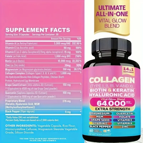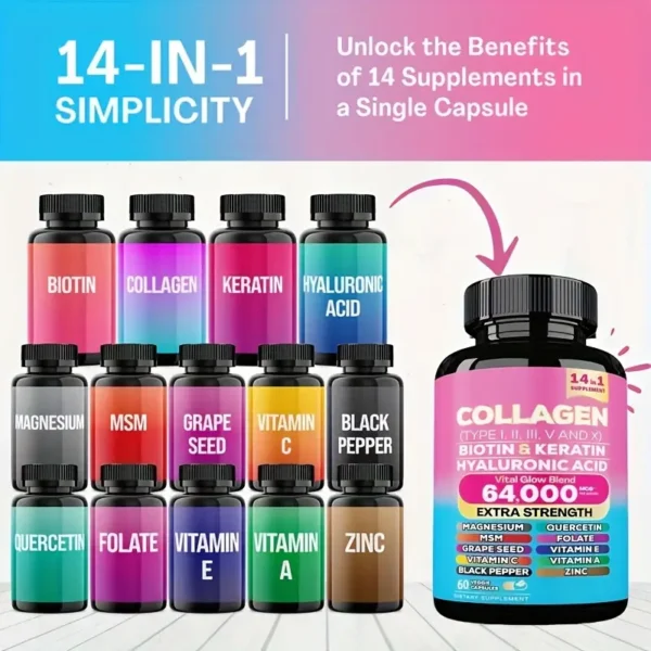 New 14-in-1 supplement combines collagen types 1, 2, 3, 5 and 10, biotin, keratin and hyaluronic acid capsules for a rich blend of 14 active ingredients. Collagen Capsules is an all-natural beauty supplement that contains collagen peptides, Vital Proteins collagen peptides and biotin, keratin is a supplement for men and women. Experience the powerful benefits of grape seed extract, quercetin, magnesium, zinc and more in one convenient formula.