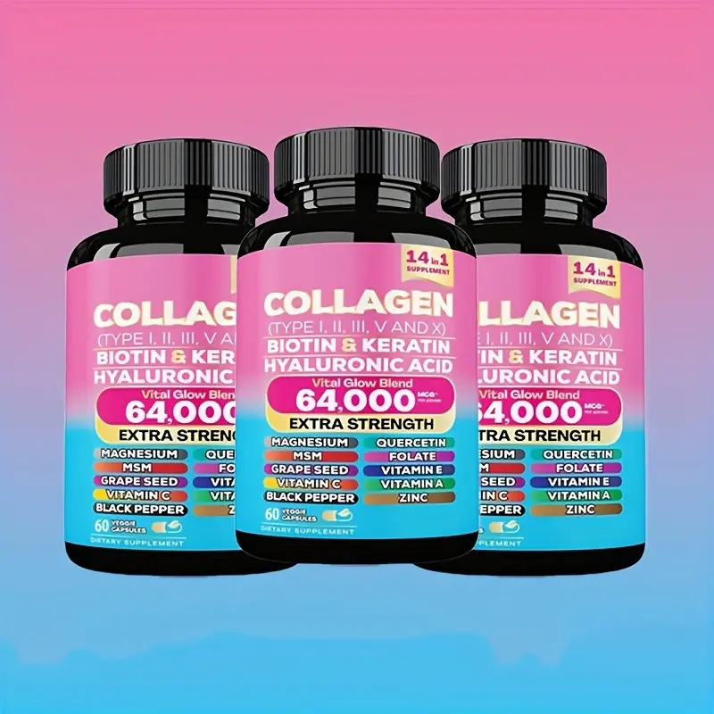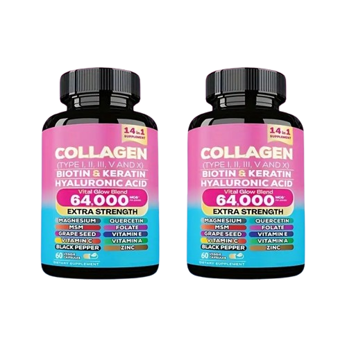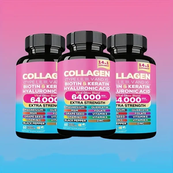 Unlock the secret to vibrant skin, strong hair, healthy nails, and flexible joints with our advanced 3-in-1 Collagen Complex. Formulated with Collagen Types I, II, III, V, and X, this powerful supplement delivers essential building blocks for overall skin elasticity, joint flexibility, and tissue repair. Enhanced with Biotin for hair and nail strength, Capillary Vitamin for healthy circulation, and Hyaluronic Acid to support hydration and skin elasticity, this all-in-one solution is your go-to for complete beauty and wellness. Whether you’re looking to improve joint mobility or boost your skin’s youthful glow, this premium blend provides targeted support for your body’s most vital structures. Perfect for daily use to enhance both your inner health and outer beauty. Non-GMO and safe for long-term use.